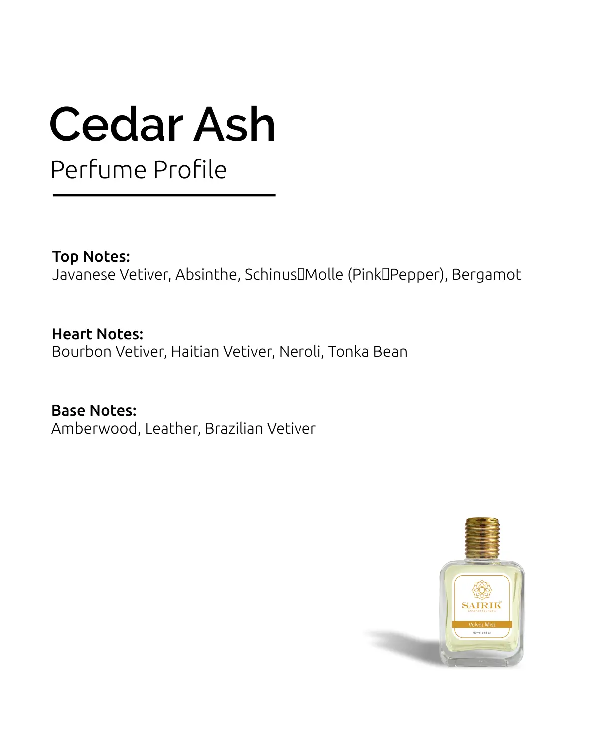 - Heart: Bourbon Vetiver, Haitian Vetiver, Neroli, Tonka Bean