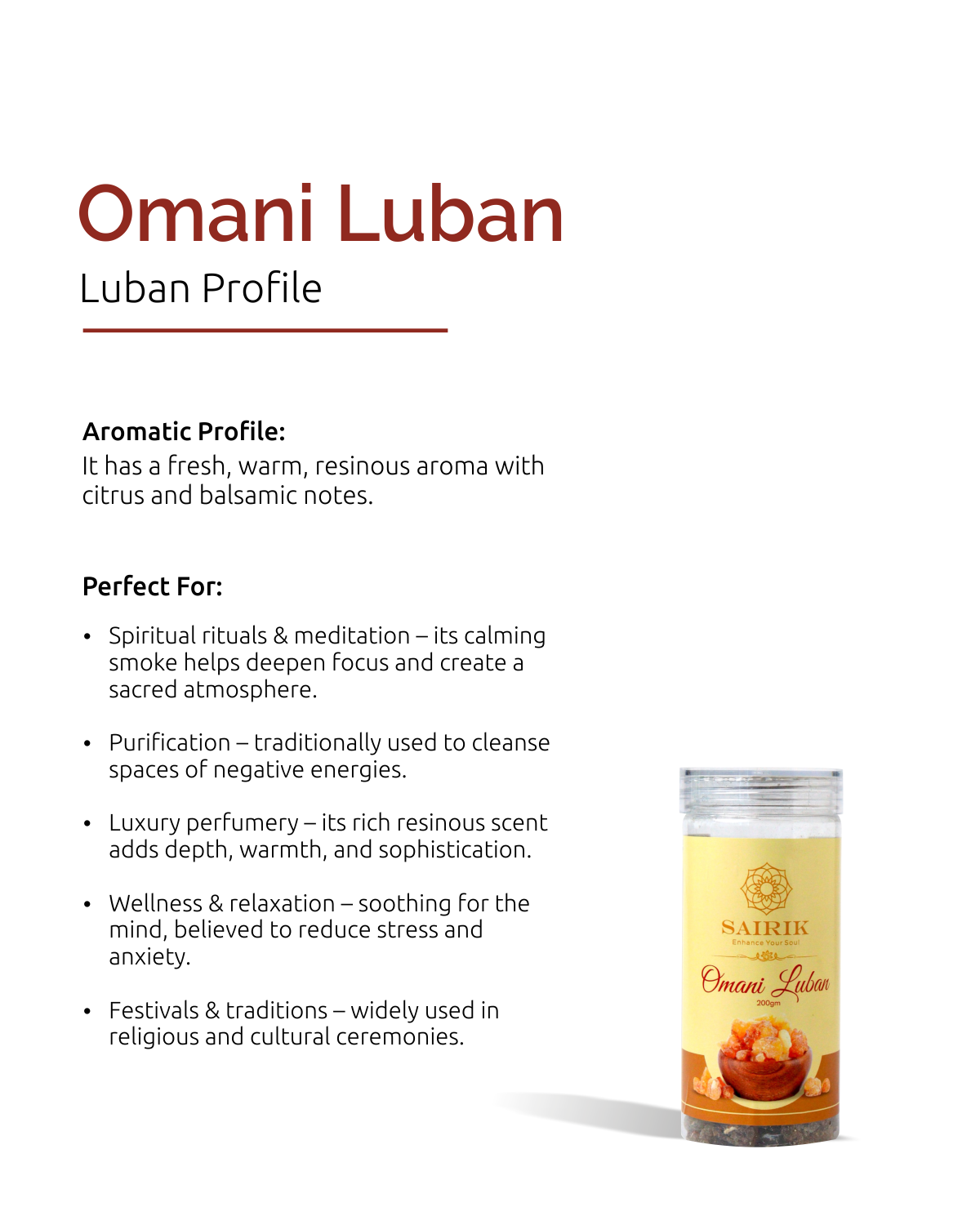 Product Overview:Â Omani Luban has a pleasant, calming fragrance and is used in aromatherapy and spiritual practices. Sairik brings you this powerful luban in its purest form. Ethically Sourced Organic Luban from Salalah, Oman.