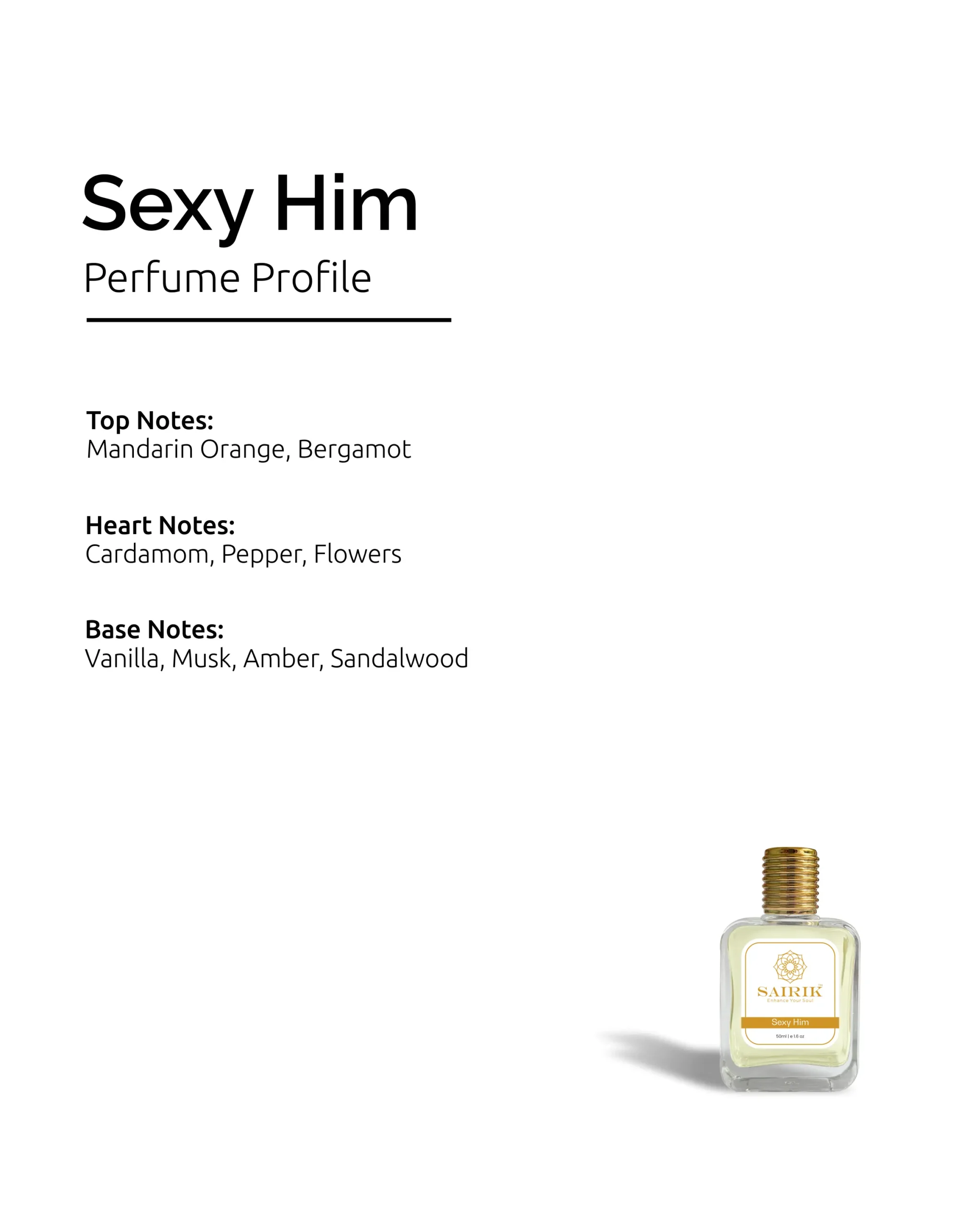 • Base: Vanilla, Musk, Amber, Sandalwood